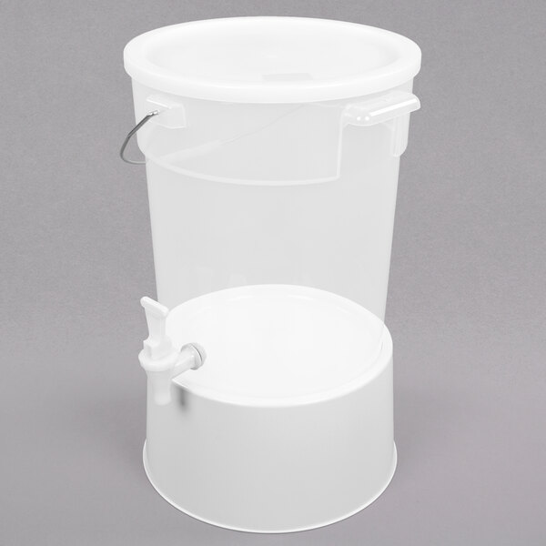 This Choice round 6 gallon translucent beverage dispenser with white base is the perfect balance between functionality, durability, and style.
