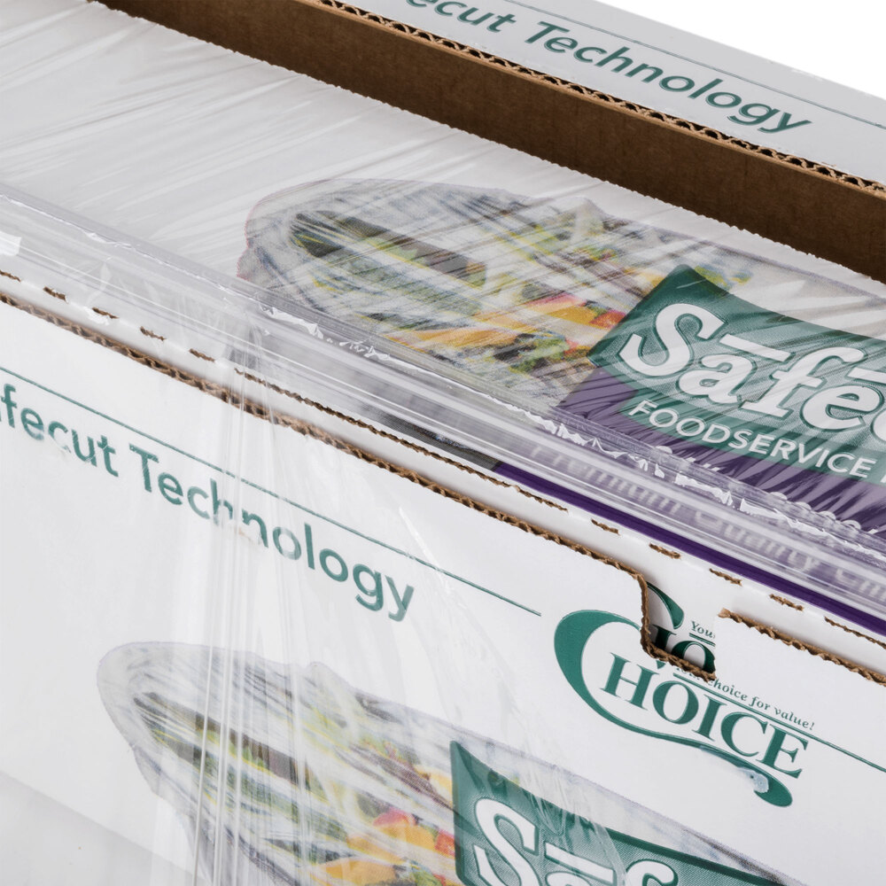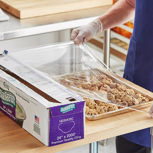 Measuring at an ample 24" width and 2,000' length, this film is perfect for every job from covering big containers, to wrapping large, bulky food items, and even securing loose serving utensils before catering events. It comes encased in a sturdy cardboard box that features the innovative, patented Safecut technology, ensuring superior safety within your bakery, deli, restaurant, or catering kitchen.