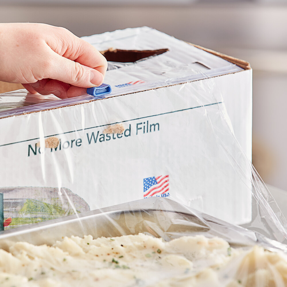 This foodservice film with slide cutter is a must for every kitchen! It clings well without leaving a sticky residue behind, and I love that it is 18" wide and easily covers large bowls.