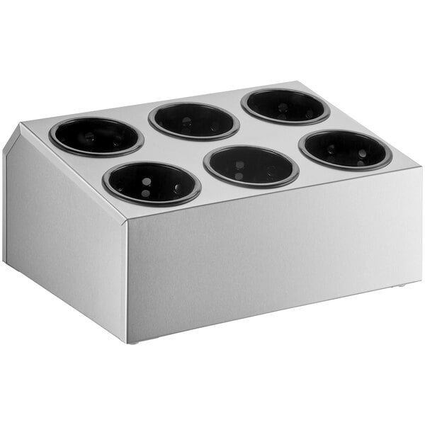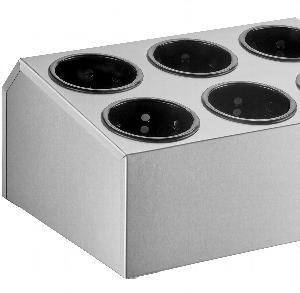 This holder is perfect for back-of-the-house use in restaurants, bars, cafes, and coffee shops. Alternatively, it works well at your buffet line or at other self-service stations. This holder keeps your flatware handy and works to give your patrons the impression of cleanliness and quality. It features six openings for flatware cylinders so you have plenty of room for your selection.