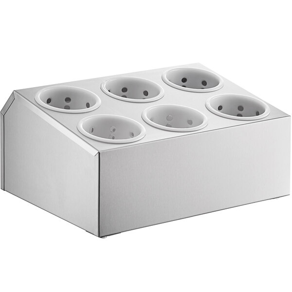 This flatware organizer features six openings that hold 6 perforated plastic flatware cylinders. Its durable stainless steel design guarantees years of dependable use in your establishment, while providing an easy-to-clean, corrosion-resistant storage solution. With a sturdy, compact construction, this organizer saves valuable countertop space while rolled edges eliminate the opportunity for debris to hide, add to the model's structural integrity, and promote user safety.