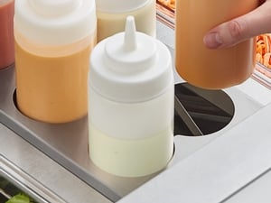 This handy bottle holder features an integrated lip design that streamlines use by helping the holder sit flush in your cold stations. This format allows for proper cold air circulation and ensures your squeeze bottles stay cool throughout service.