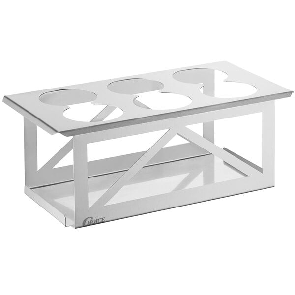 This Choice six hole stainless steel squeeze bottle holder is a great addition to cold stations, helping to achieve efficiency by keeping squeeze bottles on hand and well organized. With a diameter each of 2 15/16", the six machine-cut holes are designed to accommodate your preferred squeeze bottles.