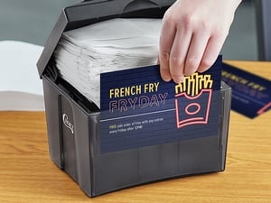 This napkin dispenser includes front and back feature slots, allowing you to display your advertising inserts in an appealing way.
