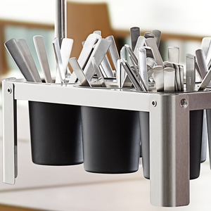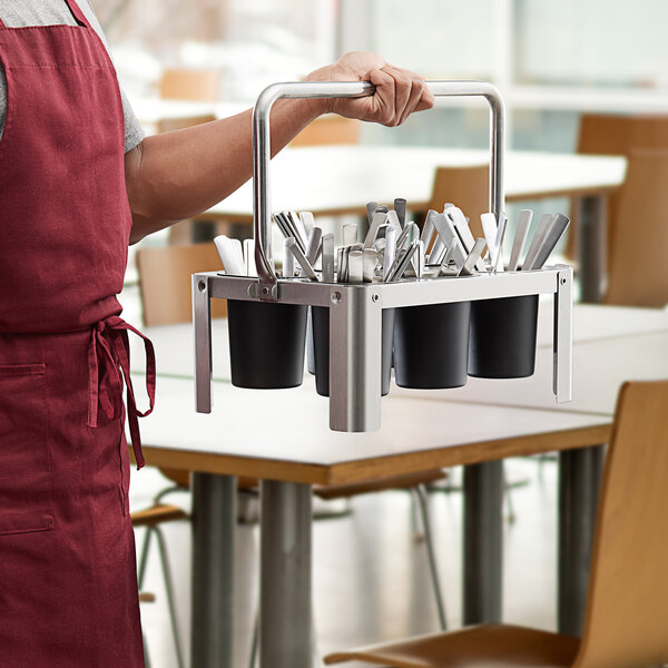 The versatile stainless steel flatware cylinders are perfect for displaying and storing pre-packaged condiments, sugar packets, flatware, and straws, providing a convenient, sanitary storage place for your utensils and pre-packaged items. The flatware carrier makes it a breeze to transport these supplies to and from your front of house display.