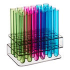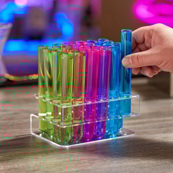 With 100 neon 5 5/8" test tube shooters as well as a rack to hold 24 at a time, you will be ready to serve signature shots in a creative and fun way right away! The tubes are made of durable polystyrene so you won't have to worry about broken glass on your bar floor, but the rack will securely hold the tubes so your customers can grab one and go whenever they like.
