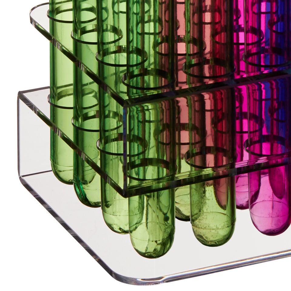 The rack can hold up to 24 shooters for easy filling and dispensing, while the one-of-a-kind design fits on all standard cocktail trays. Plus, the s-shape of the acrylic rack holds each tube near the bottom and top for reliable support at all times.