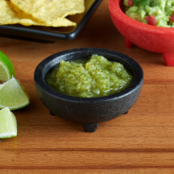 Along with favorites like pico de gallo, queso, and tableside fresh guacamole, this versatile molcajete bowl can also be used to serve hot or cold side dishes. When your customers can't wait to sit down for a mouthwatering basket of your house chips and its signature pairing, make sure it's in a bowl that offers a traditional presentation and comes at a great value to you.