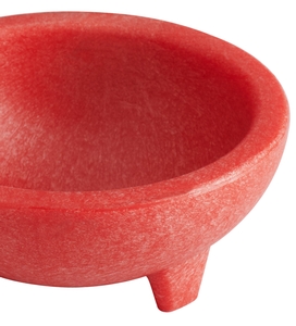 Featuring the shape of a traditional molcajete bowl with the convenience of plastic, this 4 oz. red bowl is both trendy and durable. Use it to serve customer favorites table-side for an unforgettable dining experience.