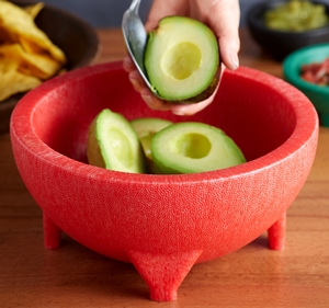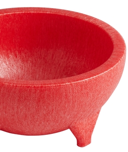 Featuring the shape of a traditional molcajete bowl with the convenience of plastic, this red bowl is both trendy and durable. The large 56 oz. capacity is perfect for family-style sides and appetizers. Use it to serve customer favorites table-side for an unforgettable dining experience!