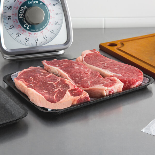 Display your freshest meats, fruits, and vegetables with this CKF 87808 (#8S) foam tray! Made of sturdy, high-quality foam, this supermarket tray is perfect for arranging produce, poultry, and more to be stored or displayed in refrigerated merchandisers at your establishment. The tray's black color draws attention to the products featured inside, and can even be used for simple product identification. Whatever you use it for, this tray is a versatile option for delis, grocery stores, and similar venues.