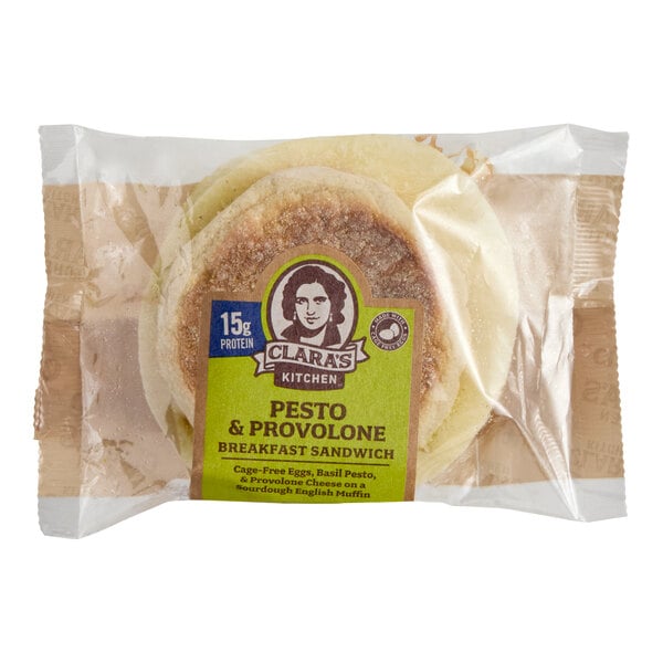 Offer a delicious and convenient breakfast to your on-the-go customers with this Clara's Kitchen pesto and provolone breakfast sandwich! This product is crafted with the finest ingredients including a sourdough english muffin, cage-free whole eggs, pesto, and provolone cheese for a tasty, hearty breakfast option. It's packed with 15 grams of protein to keep your customers full until their next meal. To make it even more convenient, this sandwich is individually wrapped and can be heated and served right in the package. To heat, loosen the wrapper and heat in the microwave on the highest setting for 90 seconds. Once heated through, let the sandwich cool for one minute before eating, then peel back the wrapper and serve.