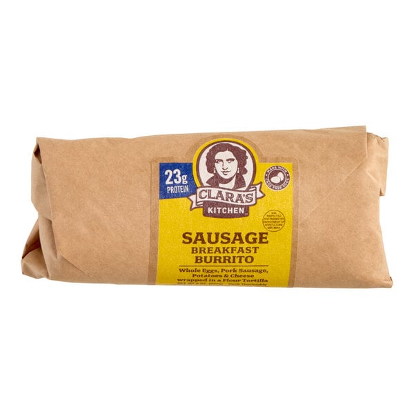 Offer a delicious and convenient breakfast to your on-the-go customers with this Clara's Kitchen sausage breakfast burrito! This product is crafted with the finest ingredients including a soft, white flour tortilla, cage-free whole eggs, potatoes, cheddar cheese, and sausage for a tasty, hearty breakfast option. It's packed with 23 grams of protein to keep your customers full until their next meal. To make it even more convenient, this burrito is individually wrapped and can be heated and served right in the package. To heat, loosen the paper wrapper and heat in the microwave on the highest setting for 90 seconds. Once heated through, peel back the wrapper and serve.