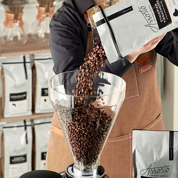 This medium roast coffee is ideal for pour-over or French press brewing methods. For a perfect pour-over, grind the beans to a medium-fine consistency, then simply pour water 30 seconds off a boil (205 degrees Fahrenheit) over them. You can prepare this coffee in commercial brewers to create large batches to keep on hand for the morning rush, or offer it in an individual pour-over coffee maker for an individualized artisan coffee experience that will please even the most discerning coffee lovers. Using a French press to brew this coffee is a wonderful way to extract the roasted toffee notes created by the long, slow roasting process! Grind the beans coarsely and pour just enough water 30 seconds off a boil (205 degrees Fahrenheit) over them to saturate all the grounds. Allow this slurry to bloom for 30 to 40 seconds before filling your French press all the way up and allowing it to steep for 3 to 4 minutes before plunging the grounds down. No matter how you choose to prepare it, serving this Arrosto Ethiopia Yirgacheffe coffee in your establishment is a testament to your discerning taste that will keep your patrons coming back for more!