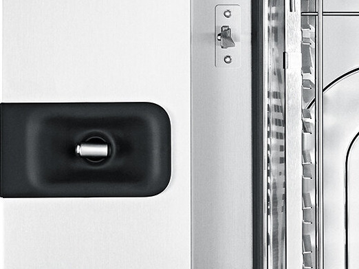 The right-hinged door can be slammed shut without breaking, which is great for busy kitchen environments. It features a two-stage handle with safety vent protection to help avoid injuries from steam, and the door opens and slides out of the way to free up aisle space, improving loading ergonomics and kitchen safety.