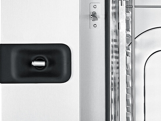 The right-hinged door can be slammed shut without breaking, which is great for busy kitchen environments. It features a two-stage handle with safety vent protection to help avoid injuries from steam, and the door opens and slides out of the way to free up aisle space, improving loading ergonomics and kitchen safety.