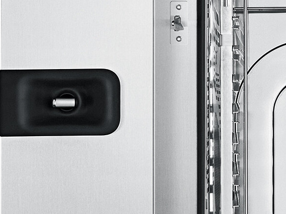 The right-hinged door can be slammed shut without breaking, which is great for busy kitchen environments. It features a two-stage handle with safety vent protection to help avoid injuries from steam, and the door opens and slides out of the way to free up aisle space, improving loading ergonomics and kitchen safety.