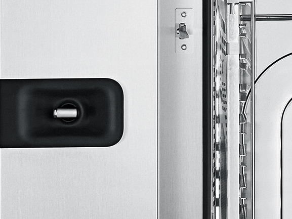 The right-hinged door can be slammed shut without breaking, which is great for busy kitchen environments. It features a two-stage handle with safety vent protection to help avoid injuries from steam, and the door opens and slides out of the way to free up aisle space, improving loading ergonomics and kitchen safety.