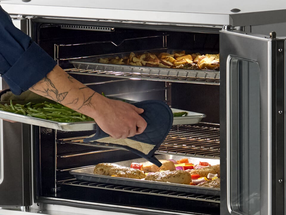 Two independent glass doors feature Bakelite handles to provide comfortable heat resistance and to provide visibility while closed. This gives you the ability to check on dishes without releasing hot air and reducing the chamber temperature.
