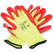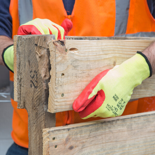 Protect your hands with this Cor-Touch CR+ yellow aramid / steel cut-resistant pair of gloves with red foam nitrile palm coating. The 13 gauge fabric offers a high level of cut resistance with EN388 CE protection of 4542 and ANSI level A4 cut protection, meaning that more than 1500 grams of weight is required to cut through the material. This ensures worry-free tasks for your employees as they can be sure the gloves will remain durable, comfortable, and fully capable of guarding against accidental cuts, even in high volume, fast-paced settings. Perfect for warehouses, construction sites, and handy-man jobs alike, this pair of gloves is sure to boost both safety and productivity.