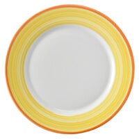 This plate features a classic round shape and a rolled edge to add a simple elegance to your table settings, and to make sure your food does not spill off the sides. Its beautiful hand-painted yellow and coral rim and bright white body create a vibrant look on your tabletop. This item's unique color and superior durability make it ideal for restaurants, hotels, senior living facilities, and catering operations. Plus, it has oven safe and salamander safe up to 380 degrees Fahrenheit. Pair this item with other dynamic colors and distinctive designs in the Calypso line to create a unique tabletop presentation that customers are sure to appreciate.