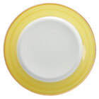 This plate features a classic round shape and a rolled edge to add a simple elegance to your table settings, and to make sure your food does not spill off the sides. Its beautiful hand-painted green and yellow rim and bright white body create a vibrant look on your tabletop. This item's unique color and superior durability make it ideal for restaurants, hotels, senior living facilities, and catering operations. Plus, it is oven safe and salamander safe up to 380 degrees Fahrenheit. Pair this item with other dynamic colors and distinctive designs in the Calypso line to create a unique tabletop presentation that customers are sure to appreciate.