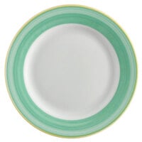 Serve your customers their favorite entrees with this Corona by GET Enterprises PA1603907612 Calypso 10" x 7 1/2" bright white rolled edge porcelain oval platter with green and yellow rim! This platter is perfect for serving your most popular entrees. Made of extra durable porcelain, this platter is designed with excellent mechanical resistance, ensuring better protection against breakage. In addition, it is scratch-resistant with thermal and chip resistant properties and high alumina content to provide extra protection. The high alumina content also provides a hard and dense body to promote a professional feel customers are sure to appreciate.