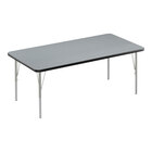 Provide a reliable work surface for a variety of tasks with this Correll adjustable height activity table! This table has a 1 1/4" thick, two-sided thermal-fused laminate top with a 1 1/8" thick high-density particle board core to stand up to frequent use by students or office staff. It is resistant to wear, scratches, stains, and food, which makes this table a great choice for science or art classes. Plus, the rounded corners ensure that there are no sharp points for students or staff to bump into. This model features silver mist legs and a black T-mold.
