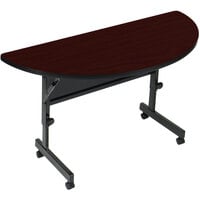 This Correll FT2472-20 Deluxe 24" x 72" mahogany flip top table is perfect for banquet facilities, conference rooms, and other areas where space is at a premium! For compact transport and storage, this table's 1 1/4" thick, high pressure top with backer sheet easily flips to one side, instantly reducing its width to 4". A black rubber T-mold edging protects its hard surface edges from chipping or other damage during use, giving it added durability. While its two black steel pedestal legs and extra support maintain excellent stability, its matching modesty panel frame provides users with privacy by shielding their legs. Plus, it boasts wire management holes that help to keep cables untangled and organized for a clean, professional appearance.