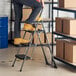 Its compact design allows it to be stored underneath desks or in storage closets without taking up a lot of space. Best of all, it has a 300 lb. weight capacity and a 14 1/2" x 12 1/4" working platform. Please be aware of your surroundings when using metal step stools. Do not use where contact may be made with live electrical circuits as the metal will conduct electricity.