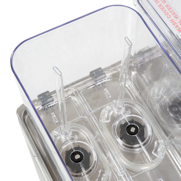 The clear plastic, easy-to-clean bowls are paired with a stainless steel base for added durability and a polished, professional look. This particular model boasts a spray nozzle within the bowl to keep the mix from settling and attract customers with a dynamic moving product. The new easy-off bowl release system decreases time spent during assembly and disassembly, while the user-friendly design enables the machine to dispense liquids until the very last drop. It has 1 large bowl with a 4.75 gallon capacity and 2 smaller bowls with a 2.4 gallon capacity, each.