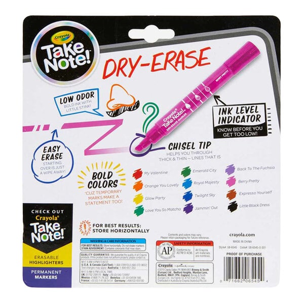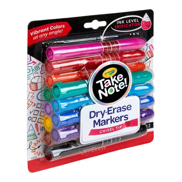 Add a colorful flair to any sign, menu display, or classroom board with these Crayola 586545 Take Note 12-count assorted color chisel tip dry erase markers. The chisel tip of these markers allows you to create bold and fine lines when writing or drawing. The ink dispenses smoothly and evenly, providing rich strokes of color that are easy to read for everyone in the room. Plus, they're designed to erase easily without leaving ghost marks or stains on your whiteboard surface.