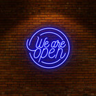 Enhance the ambiance of your establishment with this Crazy Neon LED sign. Perfect for a variety of settings including restaurants, bars, food trucks, and retail spaces, this eye-catching sign is sure to draw attention and create a vibrant atmosphere. The design features the words "We Are Open" with a double-line outline in a captivating bright red color. This striking and modern addition to your space adds a pop of color and personality, making it a must-have for any business looking to make a statement.