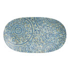 Elevate your tabletop presentation with this Creations from Steelite International Solano 14" x 8" melamine azure platter. Showcasing a deep blue hue with colorful speckled accents and intricate flourishes, this platter provides a stunning backdrop for serving shared platters, large entrees, or family-style dishes. Its ornate pattern exudes depth and sophistication, making it a distinctive addition to any tabletop.