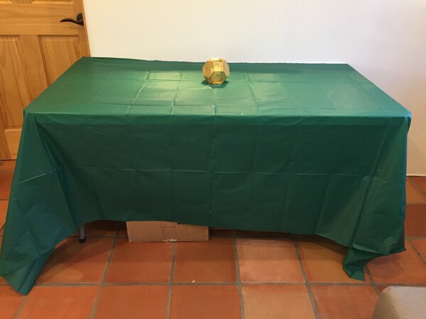 I love these Hunter green plastic table covers Great for when we have a shake party when we're done just roll it up and toss it out! perfect.