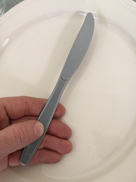 Good navy blue knife for cutting food when you don't want to use a metal utensil. Does a good job spreading jelly and peanut butter on bread.