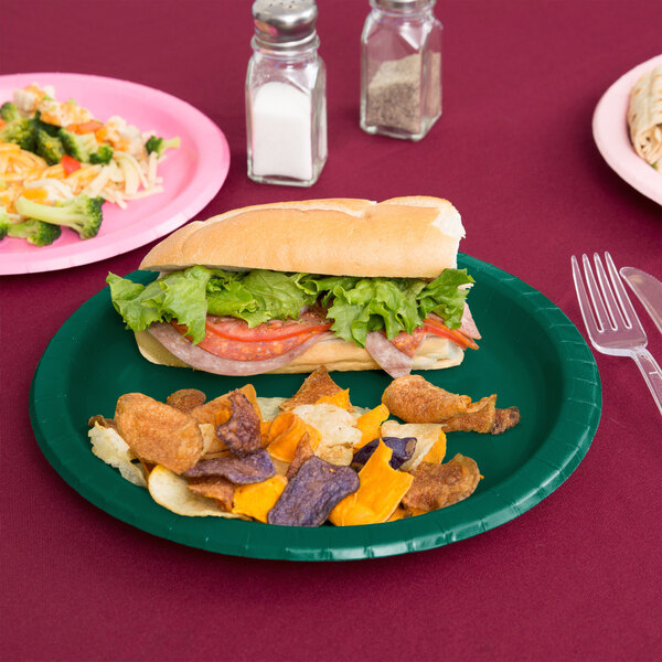 It all starts with color! This Creative Converting 503124B 10" Hunter Green round paper plate is perfect for your party, buffet, snack bar, or catered event! Its Hunter Green color adds a vibrant splash to your dining atmosphere and can easily be mixed and matched with other unique colors to match your event's theme and decor.