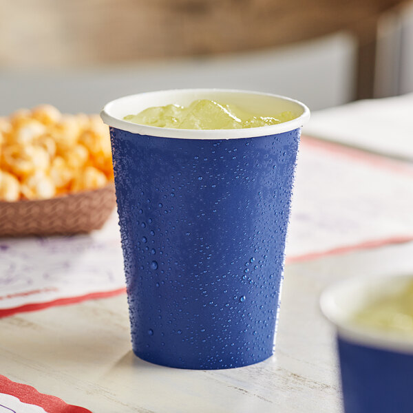 If your catering company, restaurant, or banquet facility is looking for new disposable beverageware, look no further than Creative Catering's 9 oz. navy blue poly-coated paper hot and cold cup. This product features a tightly-rolled rim for leak-proof drinking, which will help prevent spills. Both the inside and outside of this cup have a polyethylene coating for superior insulation and extra rigidity, and the cup will not weaken due to condensation. Whether you run a banquet hall, bar, or party hosting facility, Creative Converting's navy blue poly-coated paper hot and cold cup is the perfect choice for your business.