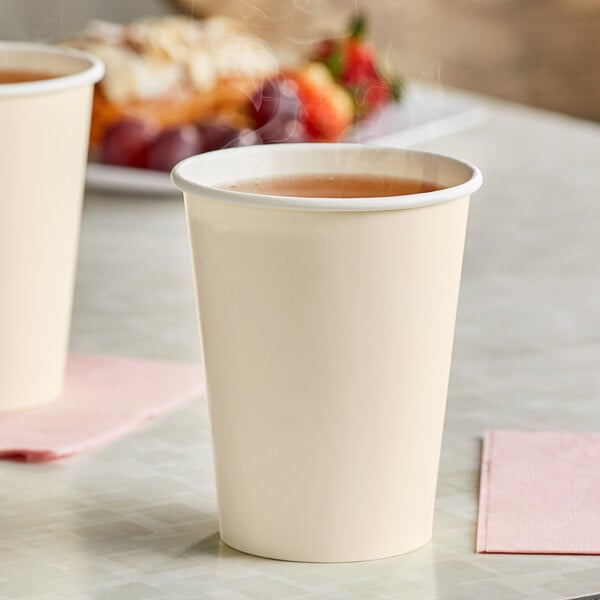 Creative Converting's 9 oz. ivory poly-coated paper hot and cold cup is perfect for your next party, family reunion, or catered event. Both the inside and outside of this durable cup feature a reinforced polyethylene coating for extra rigidity and enhanced insulation. The exterior coating also keeps the product from weakening due to condensation. Similarly, a tightly-rolled rim provides a leak-proof drinking experience and no-mess cleanup afterwards. Whether you own a party facility, social club, or catering company, Creative Converting's poly-coated paper hot and cold cup is sure to fulfill the needs of your business.