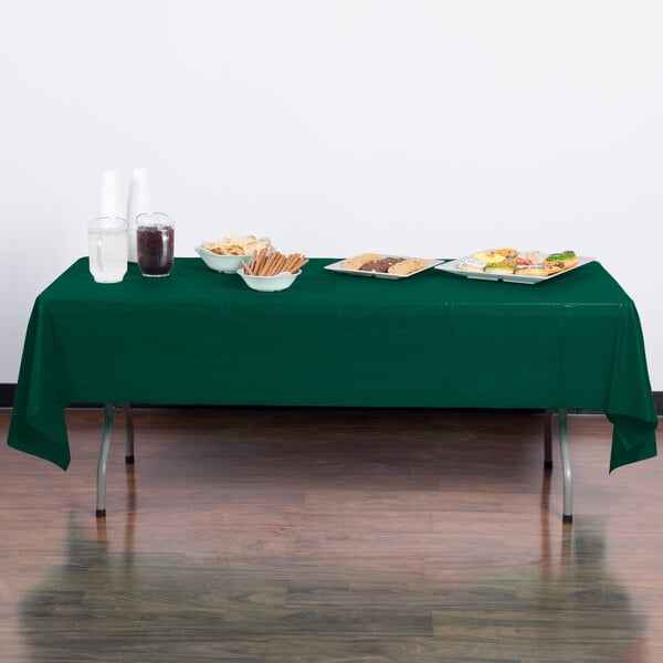 It all starts with color! This Creative Converting 723124 54" x 108" Hunter Green disposable plastic table cover is perfect for setting tables at your picnic, party, banquet, or catered event! Made of durable plastic, this table cover will repel water and other liquids, protecting your tables from damage without sacrificing appearance. Plus, the ample length fits over most tables to give you great coverage.