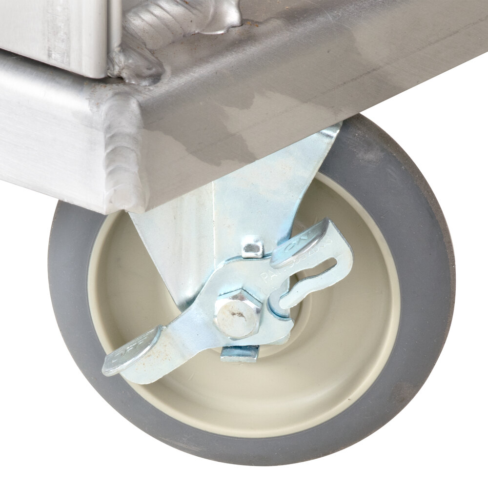 This bun pan rack stands on (4) 5" swivel casters for easy maneuverability, and 2 have a brake for keeping the rack securely in place.