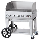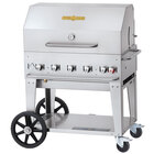 Cook high-quality grilled food at your next event with the Crown Verity CV-MCB-36RDP liquid propane 36" mobile outdoor grill with roll dome package! Whether you're catering with it or hosting a big event at your hotel, this compact, high-performance, stainless steel grill will withstand frequent usage while delivering excellent results. This grill comes with a two-stage regulator and hose for a secure connection to your tank, which you can place in a holder on the back if it's 20 lb. or less. It boasts five burners placed every 5 3/4" to ensure the most even heat pattern possible, and it produces up to 79,500 BTUH. It heats to cooking temperature within five minutes, which means that you can complete your food prep and get right to work with little wasted time.