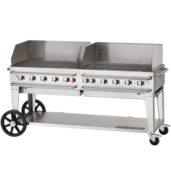 This Crown Verity RCB-72WGP 72" Pro series outdoor rental grill comes packed with everything you need to begin effectively grilling ribs, burgers, hot dogs, and chicken! Designed with frequent transportation in mind, this grill features handles on each end and double crash bars along the front to protect the controls from damage, making this unit an excellent choice for rental applications! It accommodates (2) 20 lb. propane tanks (sold separately) that power the (2) 4500 BTU lighter tubes and (10) 15,000 BTU stainless steel burners, heating the grill to cooking temperature within 5 minutes so operators can make quick work of any buffet line at large catered events and parties. 2 wind guards are included to help reduce heat loss and ensure even cooking, while the undershelf offers plenty of space to store go-to supplies.