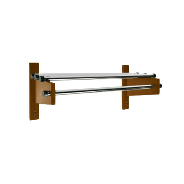 Provide your guests with a place for their coats and hats with this CSL TDE-24M 24" mahogany hardwood wall mount coat rack with chrome top bars and 1" hanging rod. Perfect for restaurants, hotels, and offices, the easy-to-clean hardwood frame with metal rods is effortless to maintain. The overhead metal rod shelf serves as great extra storage space for smaller items such as hats, scarves, and umbrellas so guests have more space at tables and bars. For added convenience, this model features a 1" diameter bar for hanging coats and jackets.