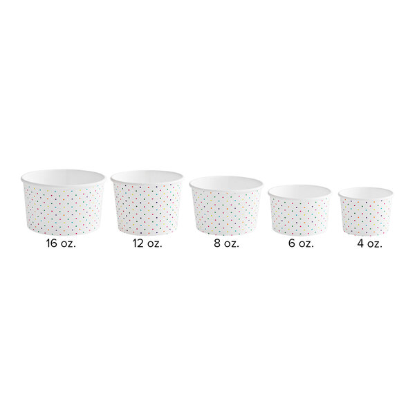 Designed for ice cream shops, concession stands, diners, restaurants, and bakeries, this versatile cup is perfect for serving take-out ice cream, frozen yogurt, and other menu favorites. Its eye-catching bright polka dot color scheme helps add a pop of personality to any setting, while the 6 oz. capacity allows users to pile on toppings or add an extra scoop of their favorite flavor with incredible ease.
