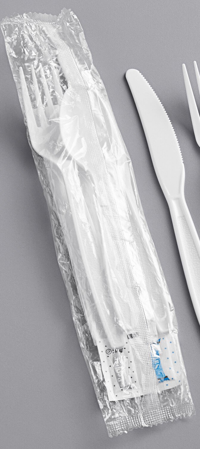• Sanitary wrapped package with fork, knife, spoon, napkin, and salt and pepper packets