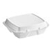 Present an entire meal in the same take out container with this Dart 90HTPF3R white foam three-compartment container with hinged lid. This partitioned clamshell container enables you to package an entire meal without the threat of cross-contact or intermixing foods. Divided into three sections, one large compartment encompasses half of this container and the remaining half is divided into two smaller compartments. The large compartment is ideal for entrees such as sandwiches, burgers, or chicken fingers. Meanwhile, the smaller sections can be used for two separate sides. Featuring a hinged lid, this container can be quickly and easily closed to keep up with the fast-paced environment of your restaurant or take out venue. With two secure closure tabs, this tightly sealed container is protected against accidental openings and spills during transport, giving your guests peace of mind knowing their meal is tightly contained. Plus, the insulated foam construction ensures your patrons' food remains hot or chilled until they are ready to eat, plus the foam material makes it a more cost-efficient option over other materials.