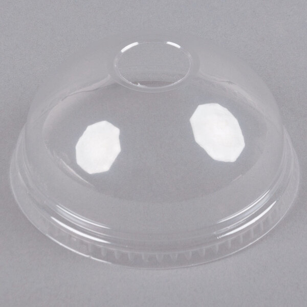 Create the perfect on-the-go product with this Solo DLR626 PET dome lid with 1" hole! Designed to fit securely on compatible Dart or Solo cups, this lid creates a tight and secure seal, helping to prevent leaking and accidental spills. Its featured ability to fit multiple cup sizes cuts down on inventory and storage space. Perfect for your cafe, concession stand, or kiosk, this lid with hole is perfect for smoothies, milkshakes, coffee drinks, and other fun beverage options since there's a 1" hole to place a straw in for easy sipping!