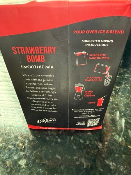 DaVinci Gourmet offers premium smoothie mixes in a variety of flavors to meet all of your drink recipe needs, including margaritas, daiquiris, and smoothies! This strawberry bomb flavor blends the sweet flavor of ripe strawberries into a smooth puree mix. Its versatile flavor pairs well with banana, coconut, chocolate, and creme. Stock your bar, coffee shop, smoothie shop, or cafe with this smoothie mix and enhance your drink menu with new, flavorful items! DaVinci Gourmet real fruit puree smoothie mix is packaged in a 48 fl. oz. carton that is easy to store in your busy kitchen or bar, with a resealable cap that keeps any unused product fresh. Refrigerate after opening. Each carton yields approximately (12) 8 fl. oz. prepared servings.