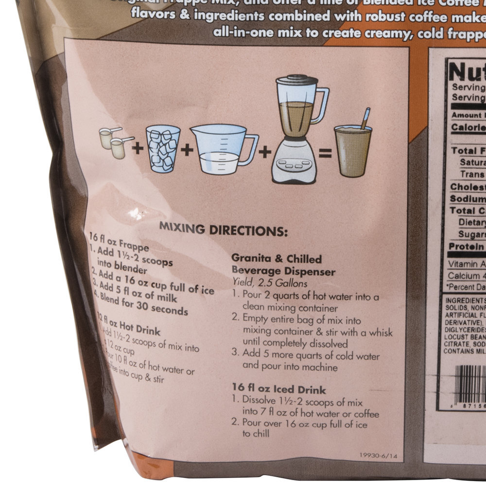 It is recommended to blend 1 part mix to 2 parts ice for simply sweet frozen beverages. Or, you can add milk, ice, and a flavoring syrup of your choice for an extra-creamy blended ice coffee or frappe. This mix is packaged in an easy-open, easy-close 3 lb. resealable bag that keeps any unused product fresh.